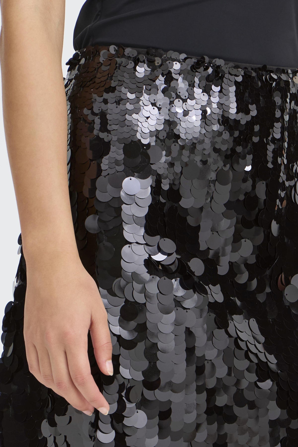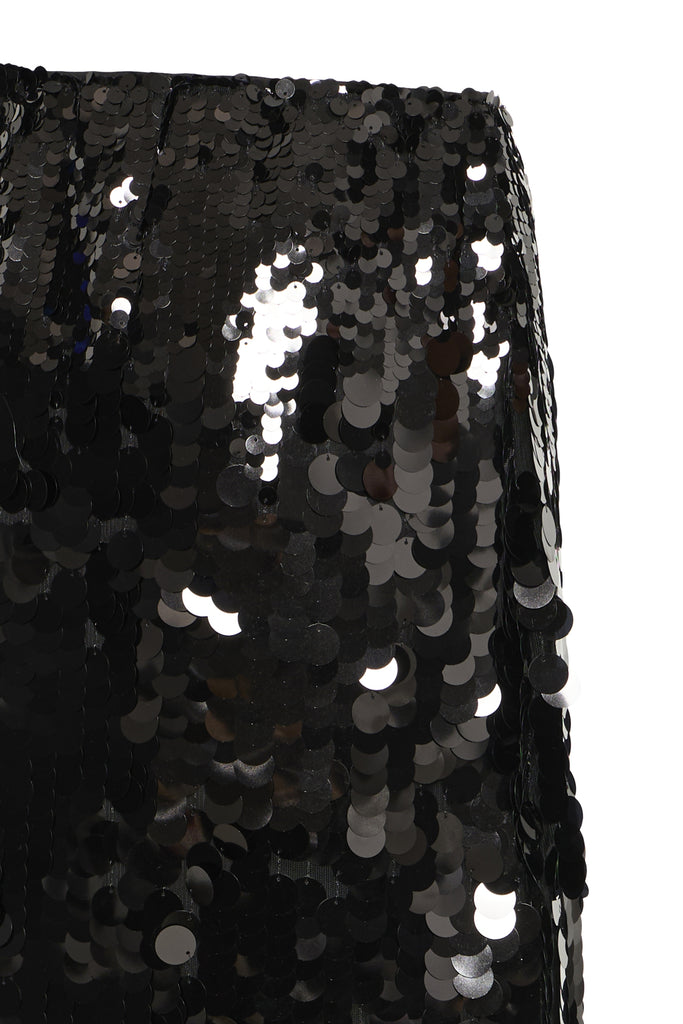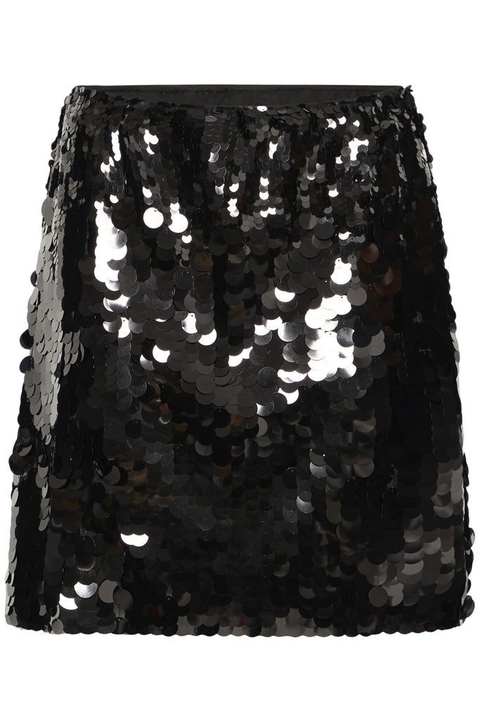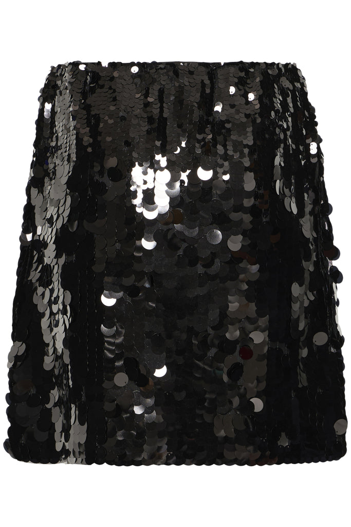 Minirock im geraden Schnitt mit auffälliger, glänzender Oberfläche durch grossflächige Pailletten. Klassischer Bund, komplett mit Pailletten besetzt.