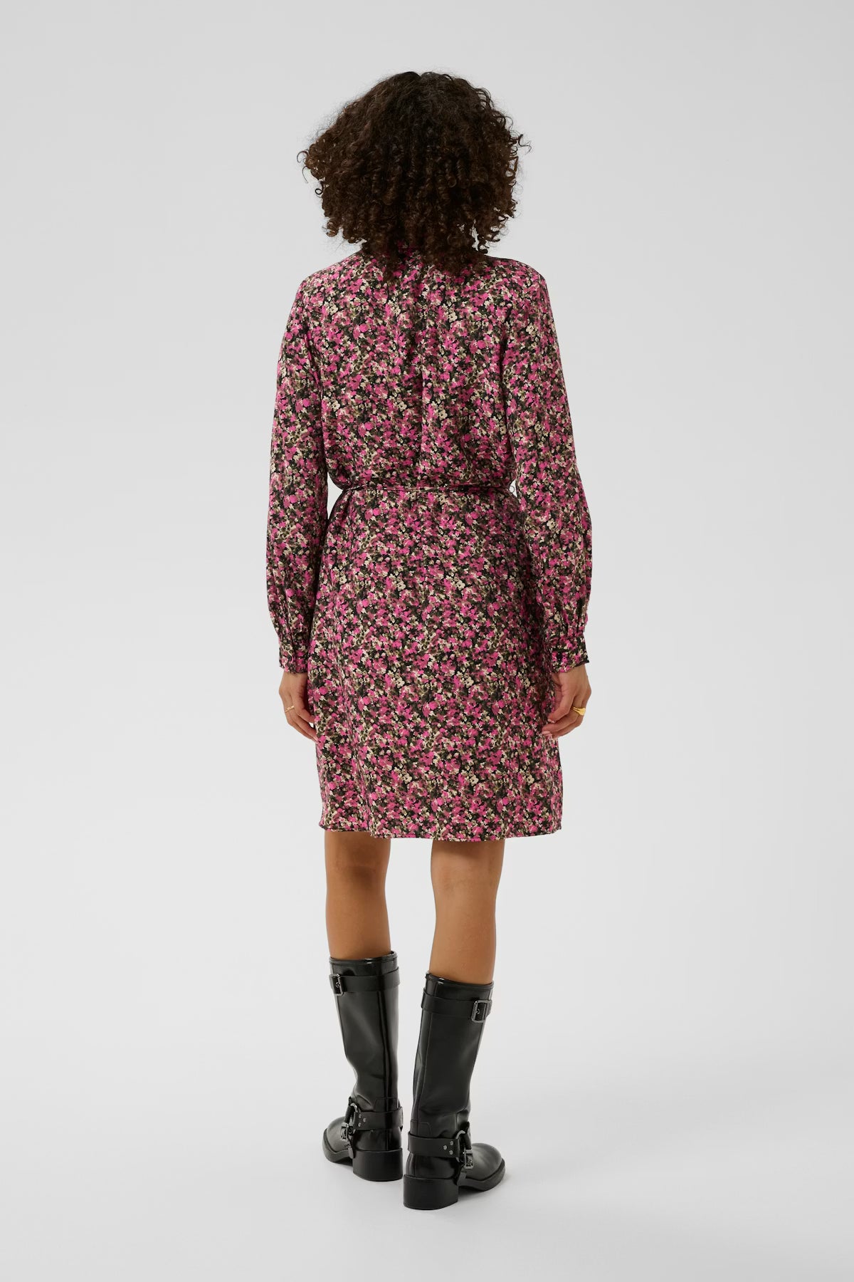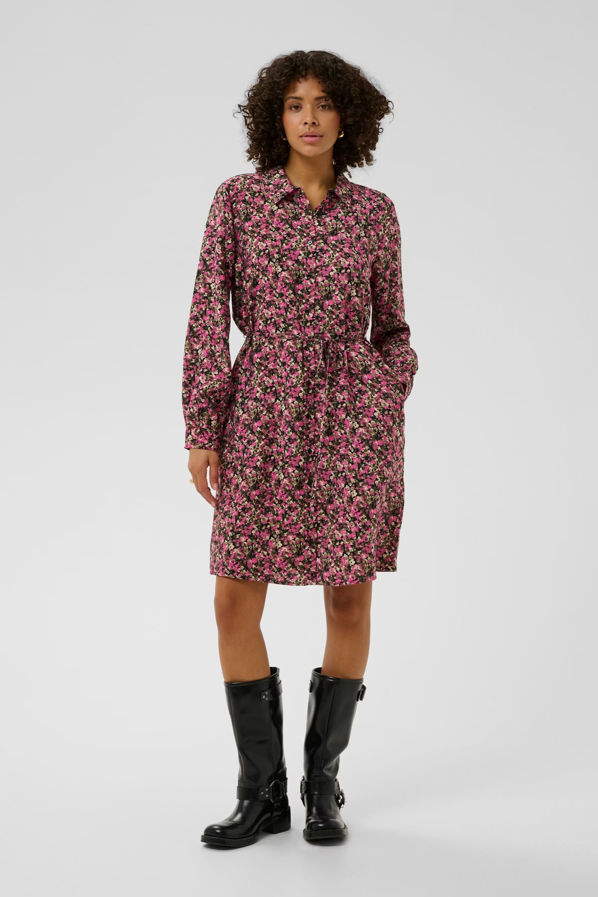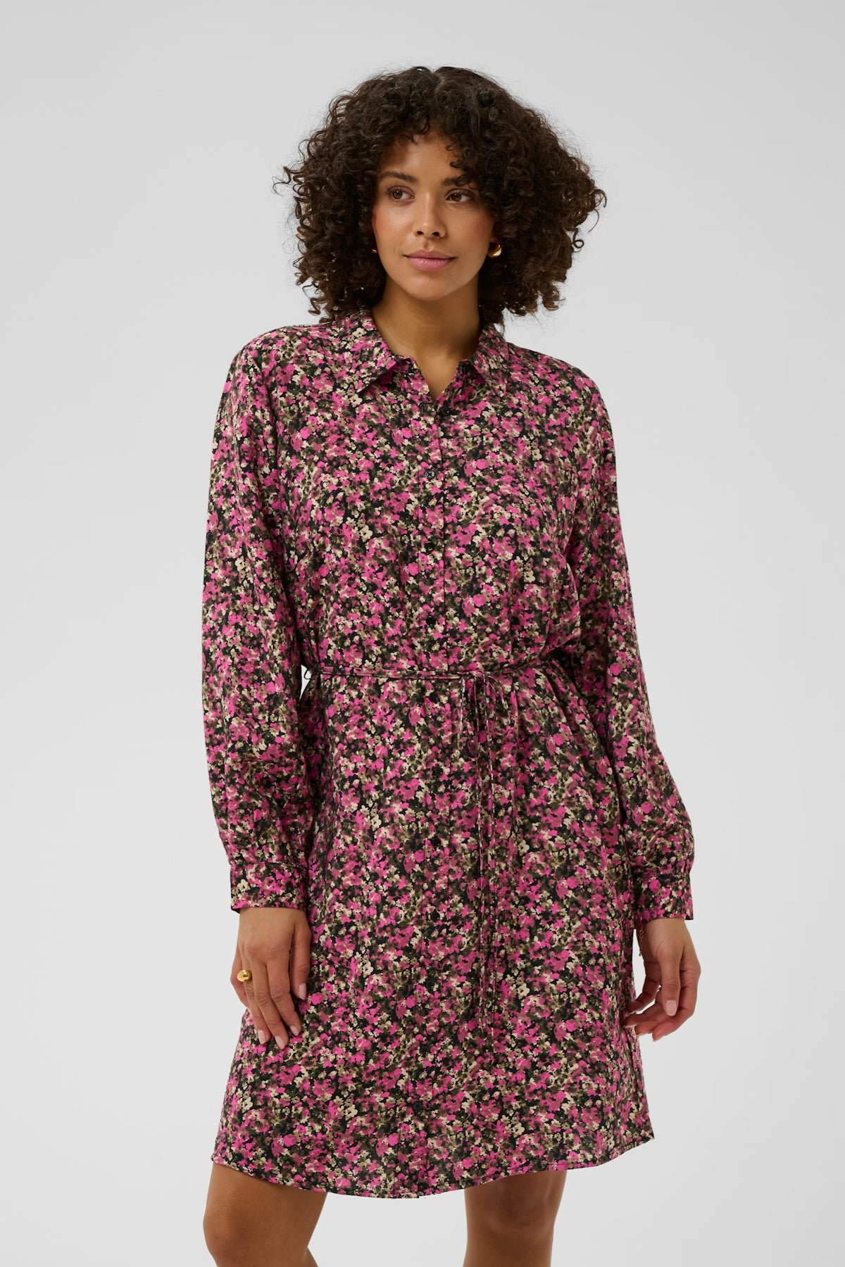 Locker geschnittenes Hemdkleid mit Kragen, Knopfleiste und langen Ärmeln. Bindegürtel akzentuiert die Taille. Knielange Silhouette.
