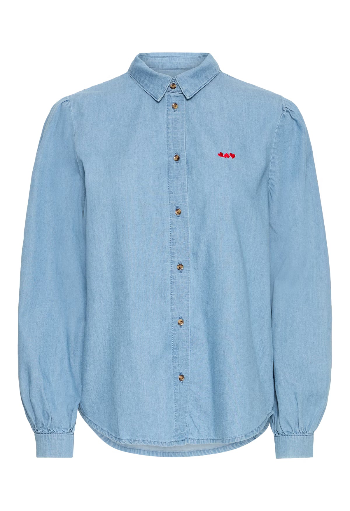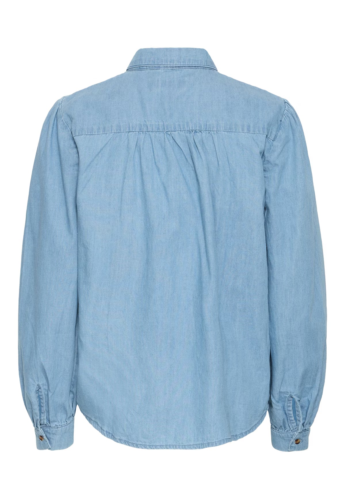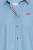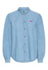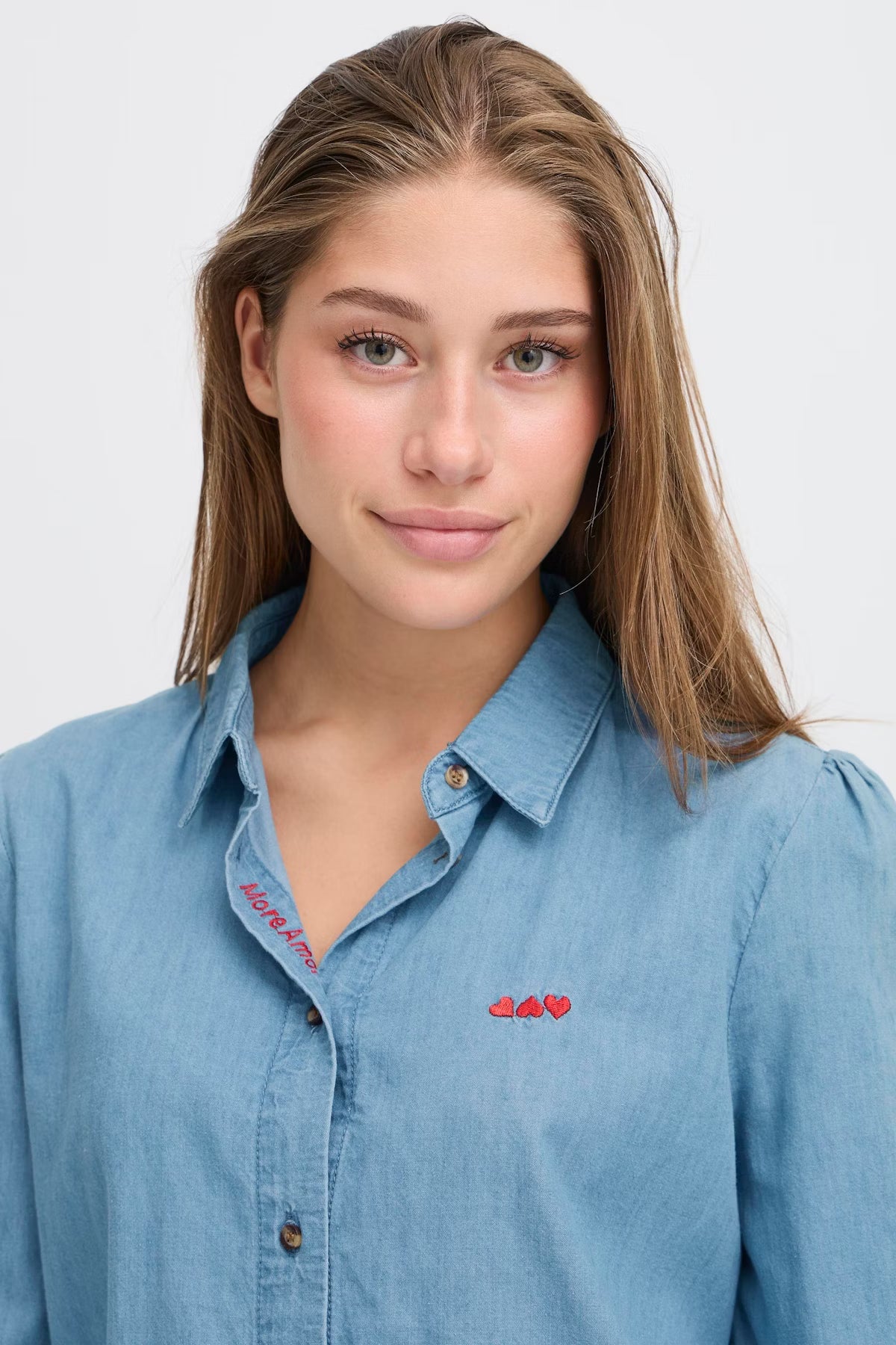 Dieses Damen-Denimhemd bietet eine lockere Passform und klassischen Schnitt. Die lange Knopfleiste, spitzer Kragen und geraffte Ärmelbündchen sorgen für vielseitigen Stil im Alltag.