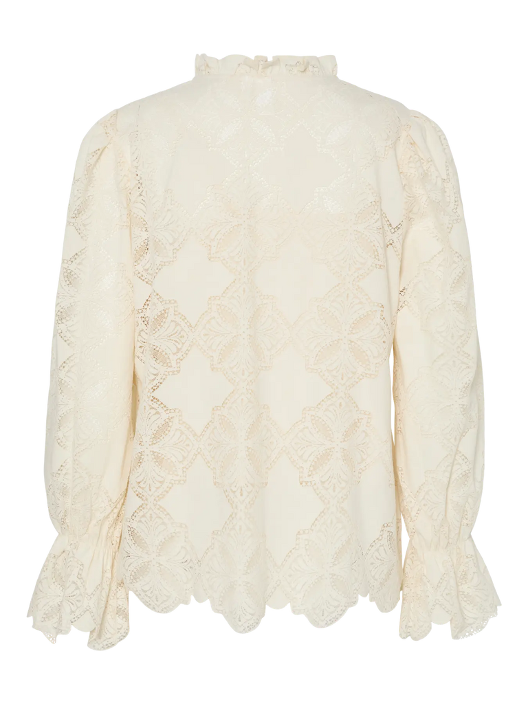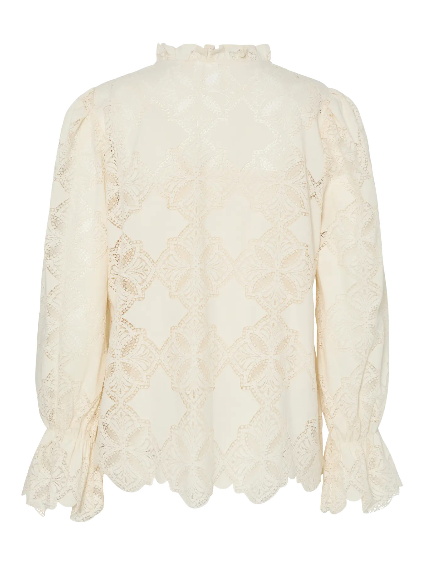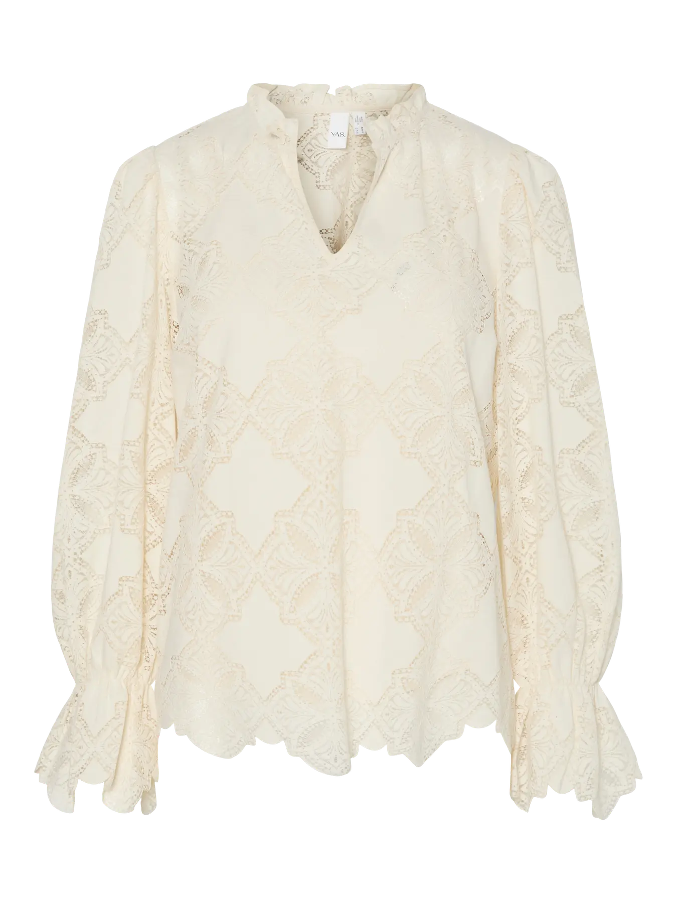 Dieser Stil besteht aus einem zarten Spitzenstoff mit femininen Mustern für einen gehobenen Look. - Produkttyp: Bluse - Hals: V-Ausschnitt - Ärmel: Lange Ärmel - Manschetten: Manschetten mit elastischer Einfassung - Futter: Polyesterfutter für einen blickdichten Look - Zusätzliche Details: Muscheldetail - Passform: Normale Passform