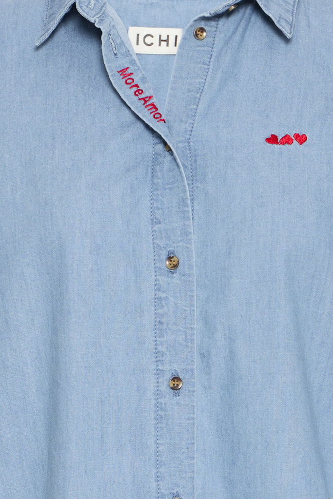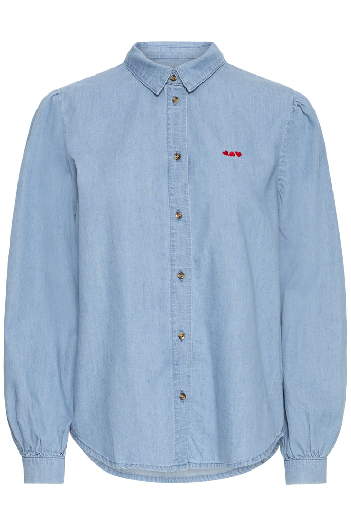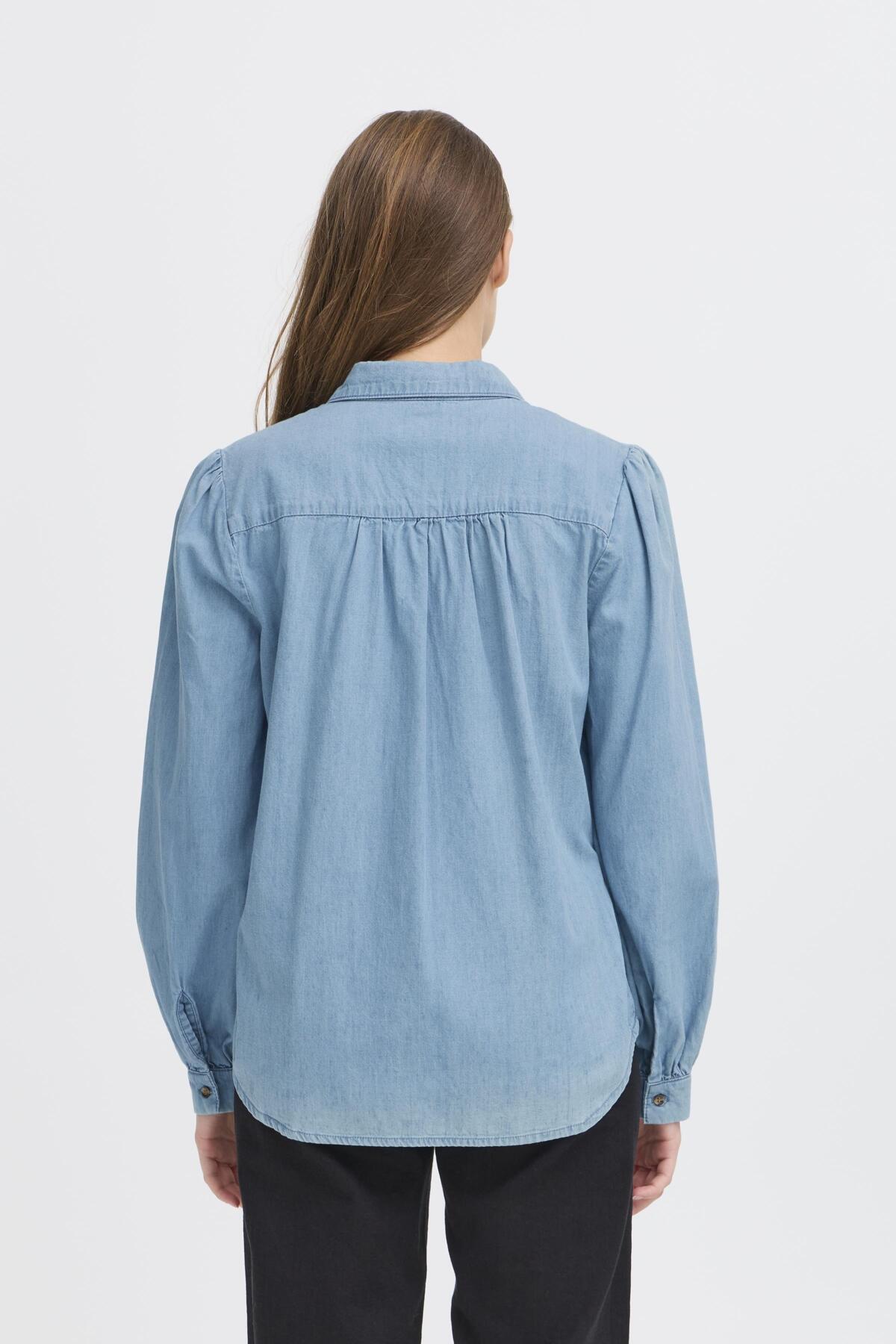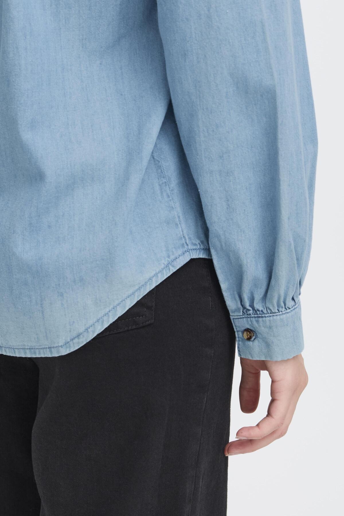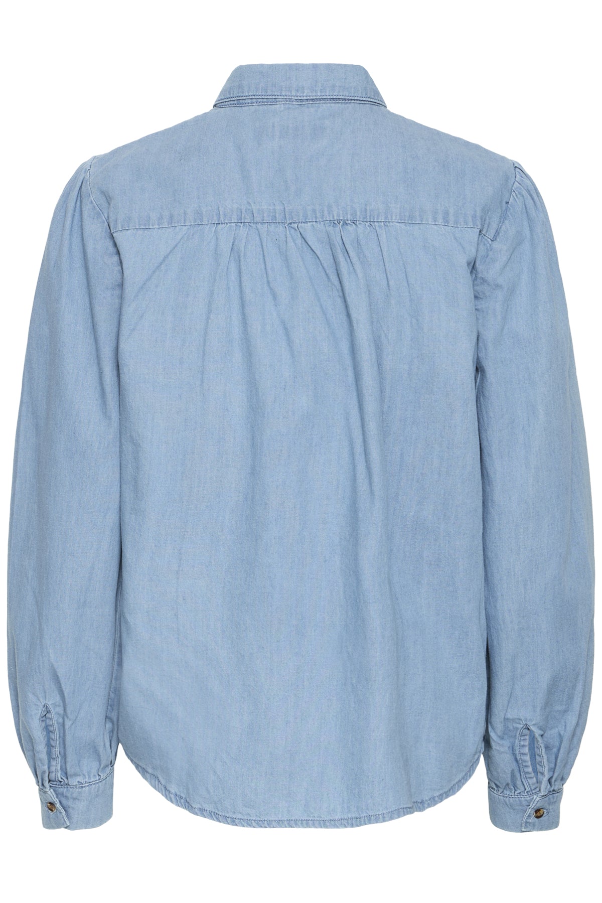 Dieses Damen-Denimhemd bietet eine lockere Passform und klassischen Schnitt. Die lange Knopfleiste, spitzer Kragen und geraffte Ärmelbündchen sorgen für vielseitigen Stil im Alltag.
