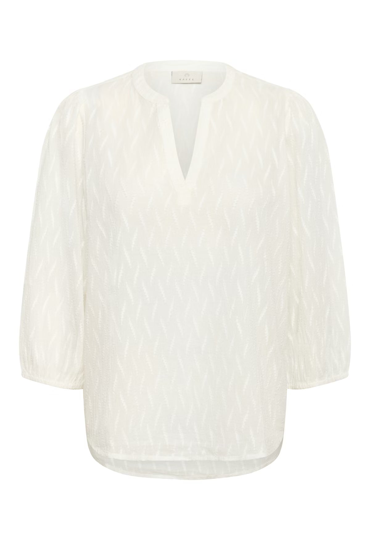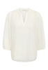 Bluse mit weicher, halbtransparenter Oberfläche, lockerer gerader Passform und 3/4-Ärmeln. Der V-Schlitz-Ausschnitt setzt einen modernen Akzent.