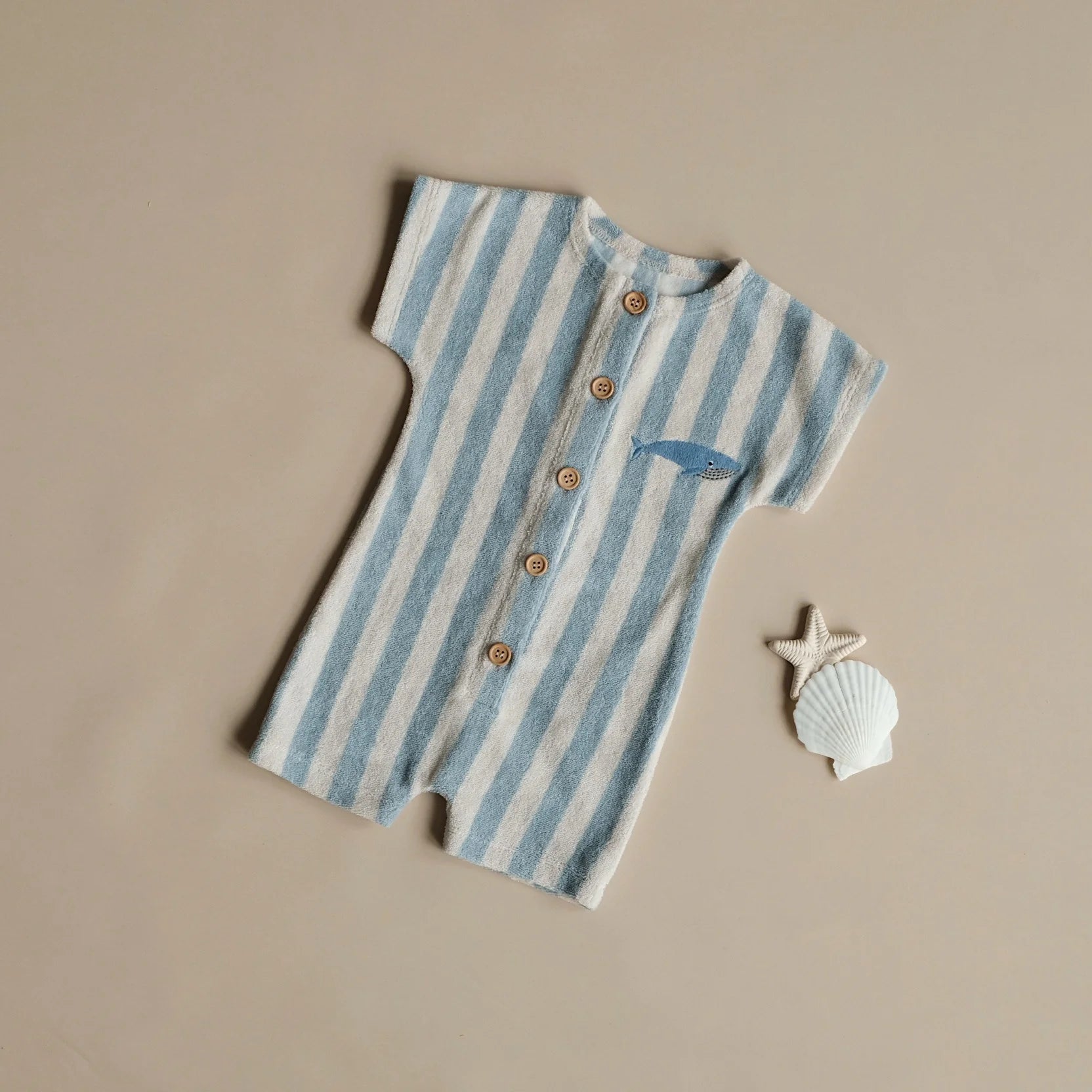 Organic Onesie aus kuschelig weichem Bio Frottee in unserem Blue Striped Design und einer niedlichen Wal-Stickerei auf der Brust.