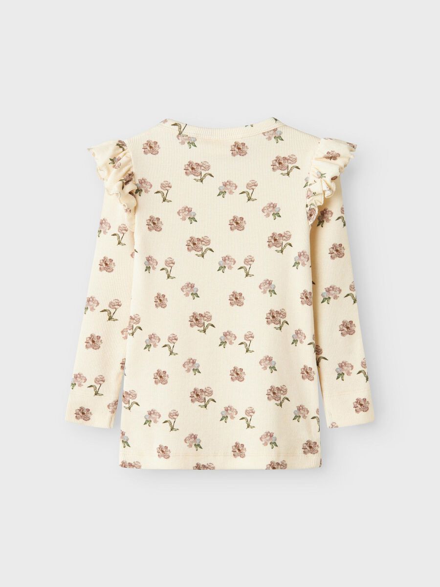- Produktart : Oberteil - Ausschnitt : Rundhalsausschnitt - Ärmel : Lange Ärmel - Weitere Details : Rüschen - Weitere Details : Label - Print : Print wiederholt sich auf dem gesamten Stoff - Passform : Slim Fit