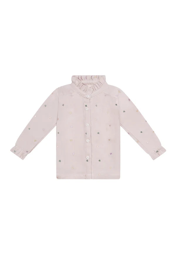 Verspielte Details wie der zarte Rüschen-Stehkragen, fein gekräuselte Ärmelabschlüsse und eine durchgehende Herzstickerei verleihen der Bluse eine besonders charmante Note. Der sanfte Lavendelton rundet das Design harmonisch ab und macht dieses Kleidungsstück zu einem echten Lieblingsstück im Kleiderschrank.
