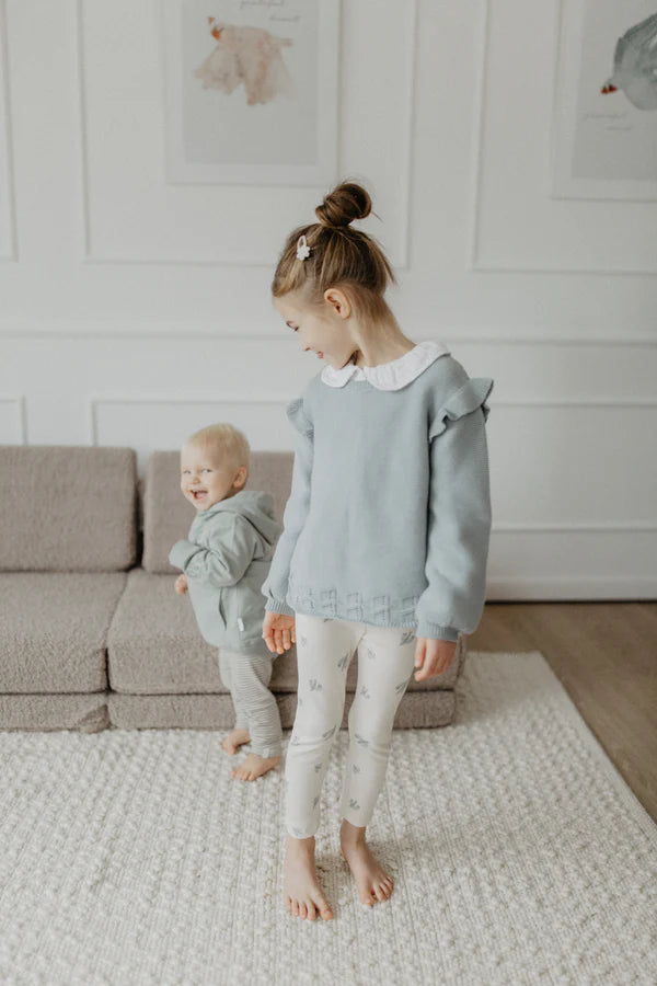 Der zarte hellbeige Grundton wird von einem liebevollen Allover-Print in Hellblau mit verspielten Vögeln geziert – ein echter Hingucker für jeden Tag. Der elastische Bund sorgt für optimalen Sitz und Bewegungsfreiheit beim Spielen, Toben und Entspannen.
