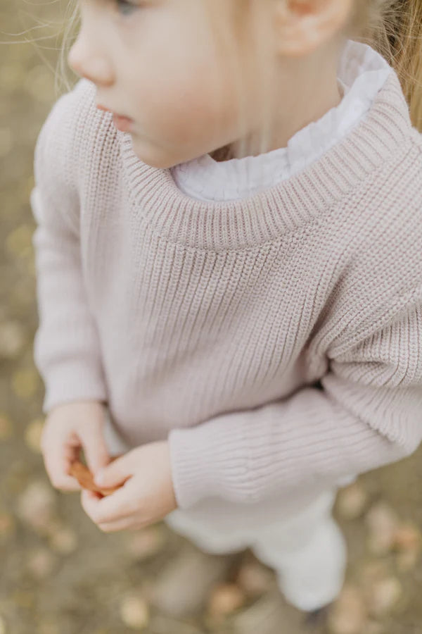 Dieser kuschelige Pullover in Chunky-Strickoptik vereint Wärme, Stil und Nachhaltigkeit. Gefertigt aus einer weichen Mischung aus Bio-Baumwolle und Merinowolle, bietet er ein besonders angenehmes Tragegefühl – perfekt für kühlere Tage. Mit seinem klassischen Rundhalsausschnitt, den langen Ärmeln und der groben Strickstruktur wird er schnell zum Lieblingsstück in der Garderobe. Der zarte Lavendelton bringt eine frische, ruhige Farbnote in jedes Outfit.