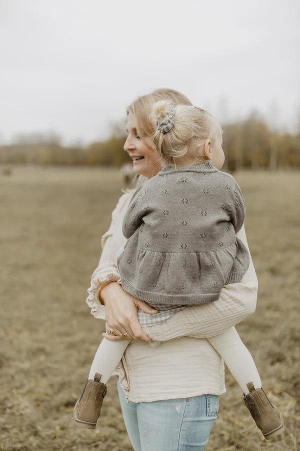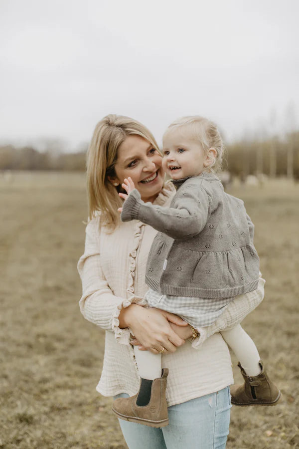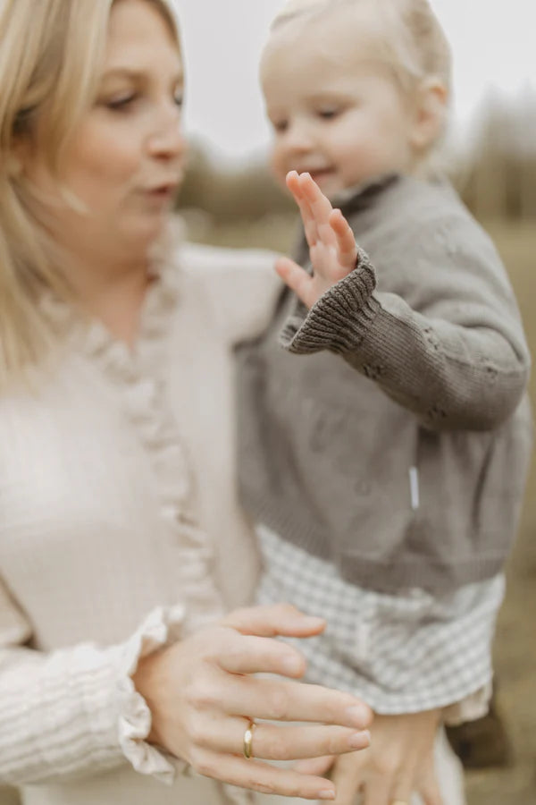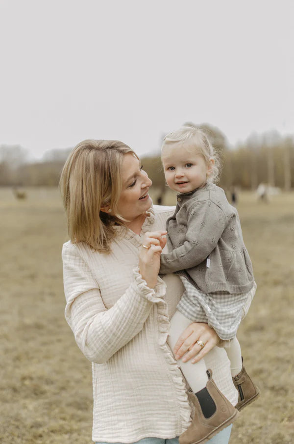 Dieser liebevoll gestaltete Cardigan überzeugt durch feine Details und natürlichen Komfort. Gefertigt aus einer weichen Mischung aus Bio-Baumwolle und Merinowolle, bietet er ein angenehm leichtes und gleichzeitig wärmendes Tragegefühl. Das zarte Ajourstrickmuster verleiht dem Design eine luftige Eleganz, während der gewellte Kragen und das ausgestellte Schößchen (Peplum) für eine besonders verspielte Silhouette sorgen. Elastische Bündchen sorgen für eine bequeme Passform – perfekt für stilvolle Alltagslooks mit besonderem Charme.