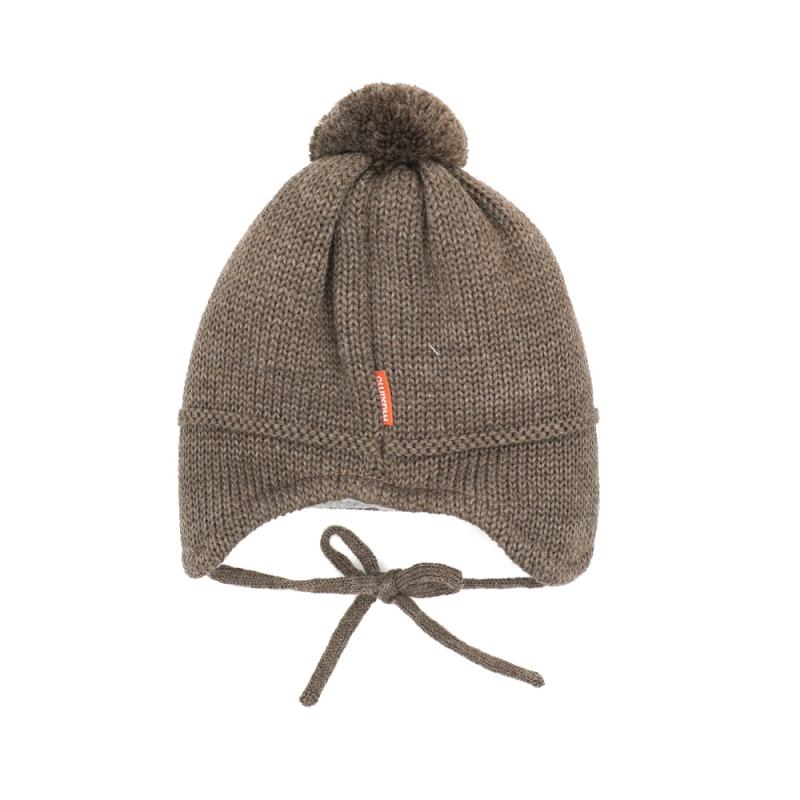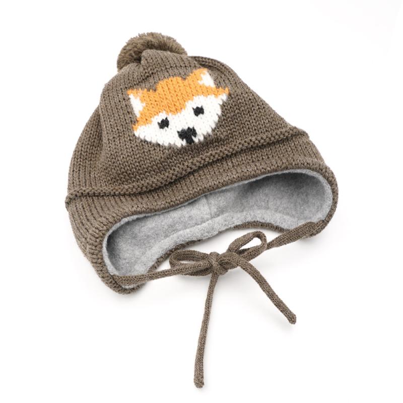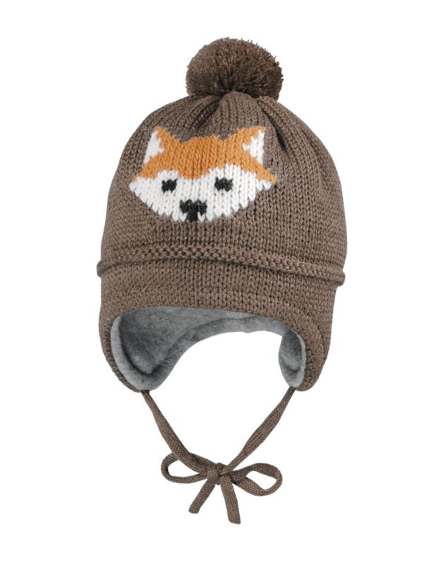 MINI BOY-Mütze, Intarsie Fuchs ausgenäht, Bindeband, Pompon, Futter