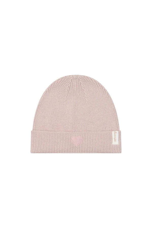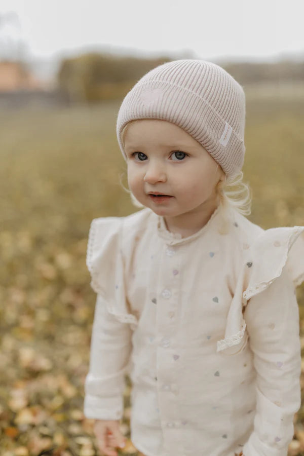 Unsere gestrickte Mütze hält kleine Köpfe wohlig warm und rundet jedes Outfit mit einem Hauch zeitloser Schlichtheit ab - weich, stilvoll und perfekt für kühle Tage. Die Herzchen-Stickerei auf der Vorderseite setzt einen liebevollen Blickfang.