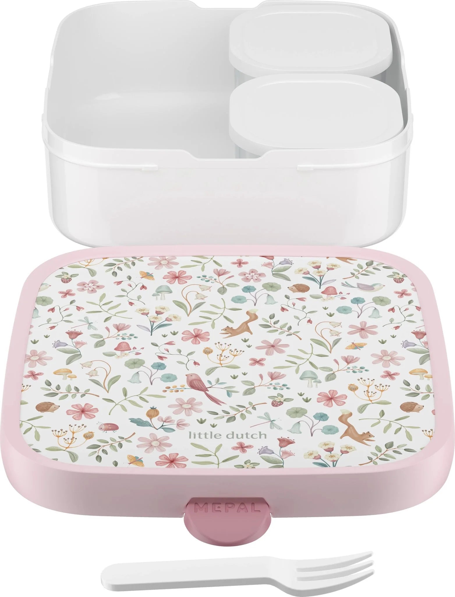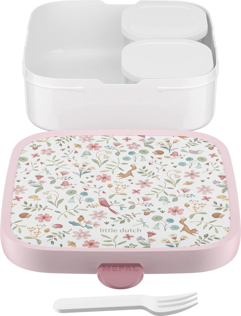 Ein Mittagessen voller Verwunderung. Die extra große Lunchbox mit dem verträumten Fairy Wonders Druck von Little Dutch ist perfekt für kleine Tagträumer, die Abwechslung lieben. Die Lunchbox enthält zwei herausnehmbare, auslaufsichere Bentobehälter und eine praktische Gabel. So kann man Brot, Obst oder einen Joghurtbecher leicht mitnehmen. Alles bleibt frisch und ordentlich an seinem Platz in den verschließbaren Behältern. Möchtest du lieber ein großes Fach? Nimm die Bentobehälter heraus und du hast genug Platz für Sandwiches. Nach Gebrauch dürfen die Lunchbox und die Behälter einfach in die Spülmaschine, und die Behälter dürfen sogar ohne Deckel in die Mikrowelle. Leicht zu öffnen von kleinen Händen und mit feenhaften Illustrationen, die jeden Essensmoment zu einem kleinen Fest machen.