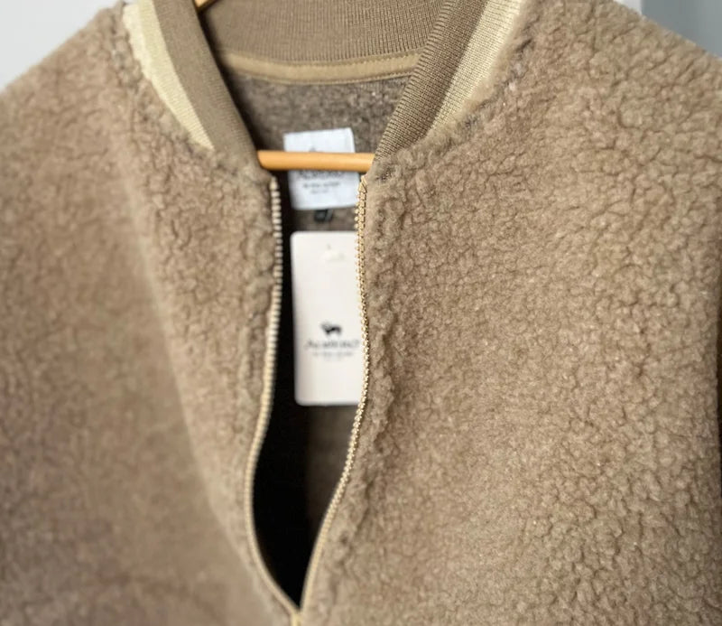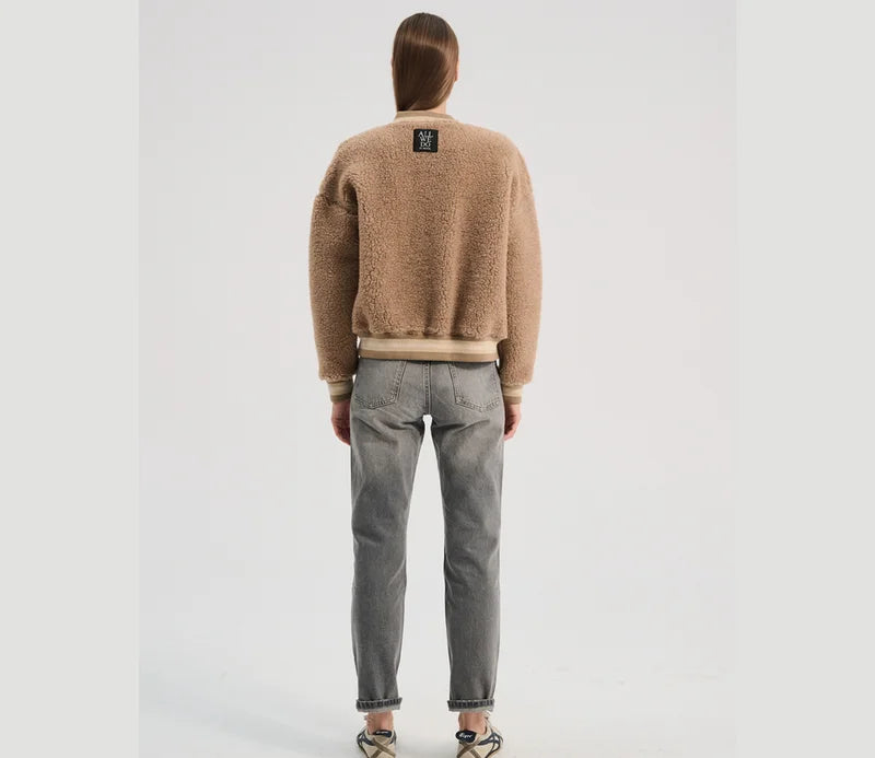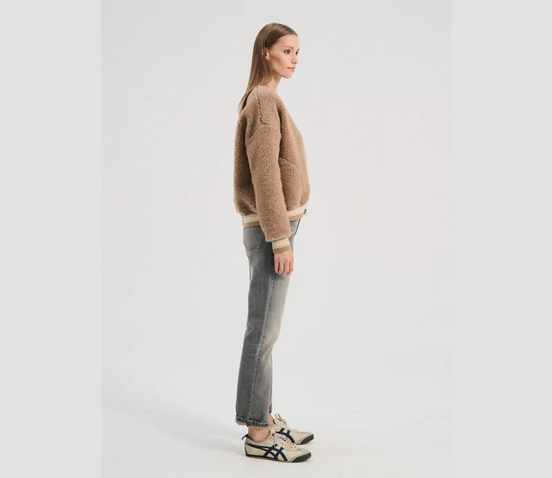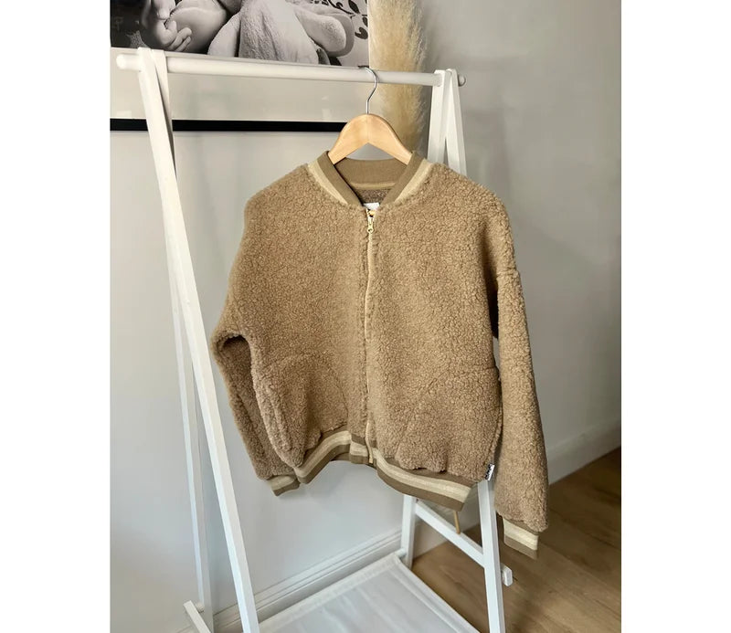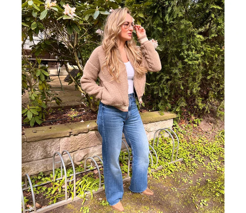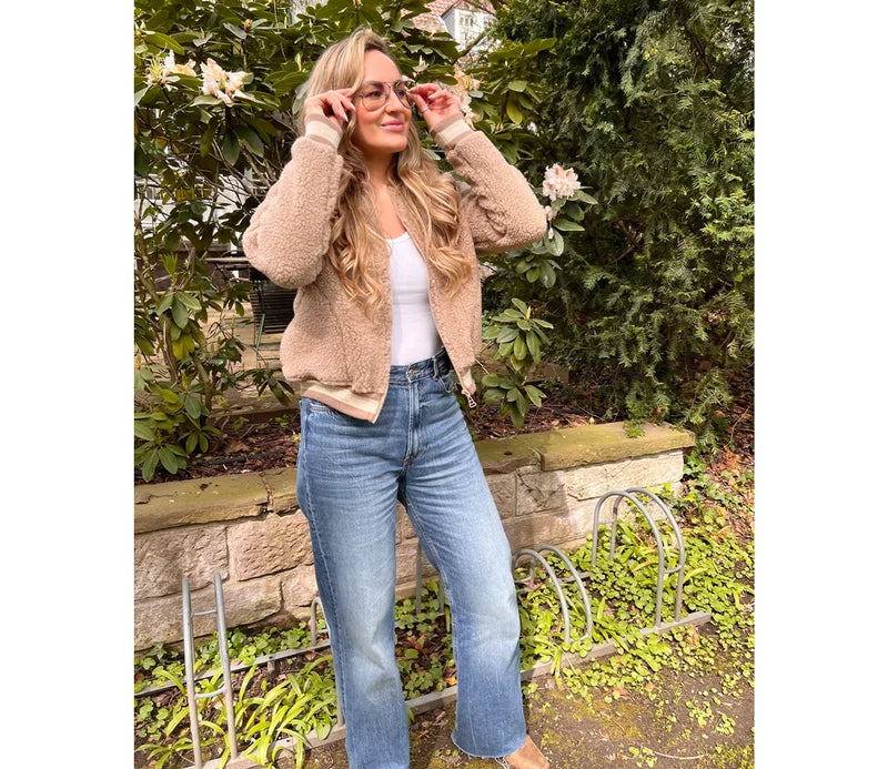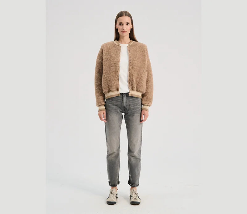 Kurze, leichte Bomberjacke, mit gesenkten Schultern.
